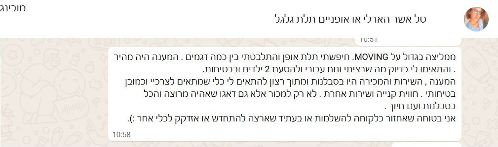 ממליצה בגדול על MOVING. חיפשתי תלת אופן והתלבטתי בין כמה דגמים. המענה היה מהיר. והתאימו לי בדיוק מה שרציתי ונוח עבורי להסעת 2 ילדים ובבטיחות.